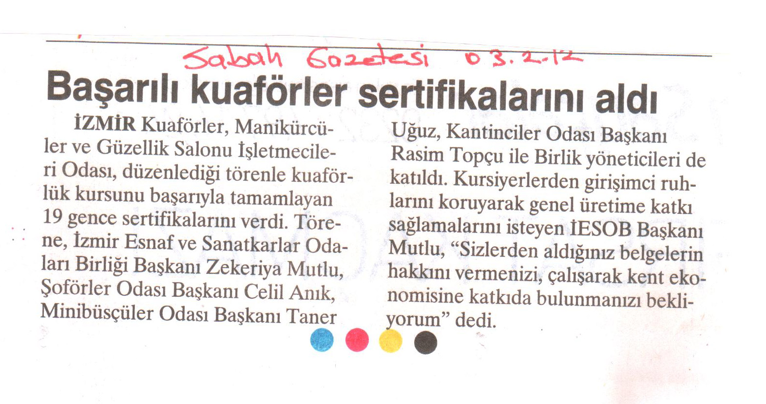 T.C. Çalışma ve Sosyal Güvenlik Bakanlığı, Türkiye İş Kur Genel Müdürlüğü, İzmir İl Müdürlüğü, Milli Eğitim Bakanlığı, İl Milli Eğitim Müdürlüğü ve Odamız işbirliği ile düzenlendiğimiz % 30 istihdam garantili 600 saatlik Kuaför kursumuzu başarı ile bitiren kursiyerlerimize 01 Şubat 2012 tarihinde saat 13: 00 – 14 :00 arası Birlik Plaza toplantı salonunda İzmir Esnaf ve Sanatkarlar Odaları Birliği Başkanı Sayın Zekeriya MUTLU nun da katıldığı belgelendirme töreni.